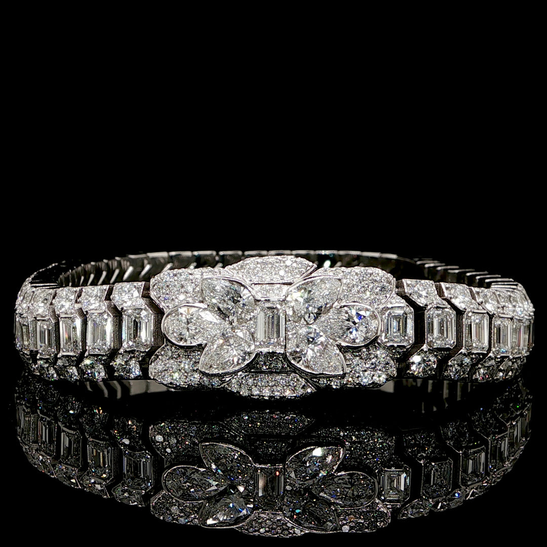 Featuring a one-of-a-kind linkage system, this design creates the illusion of emerald-cut diamonds floating seamlessly above a continuous stream of round diamonds. The result? A mesmerizing visual flow that’s unlike anything you’ve seen before.