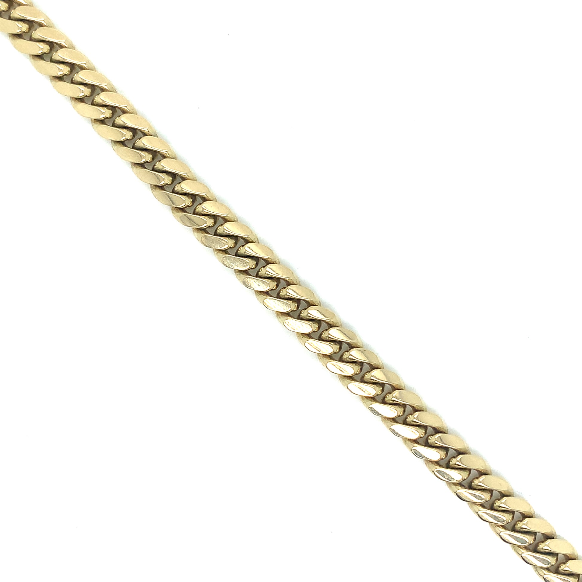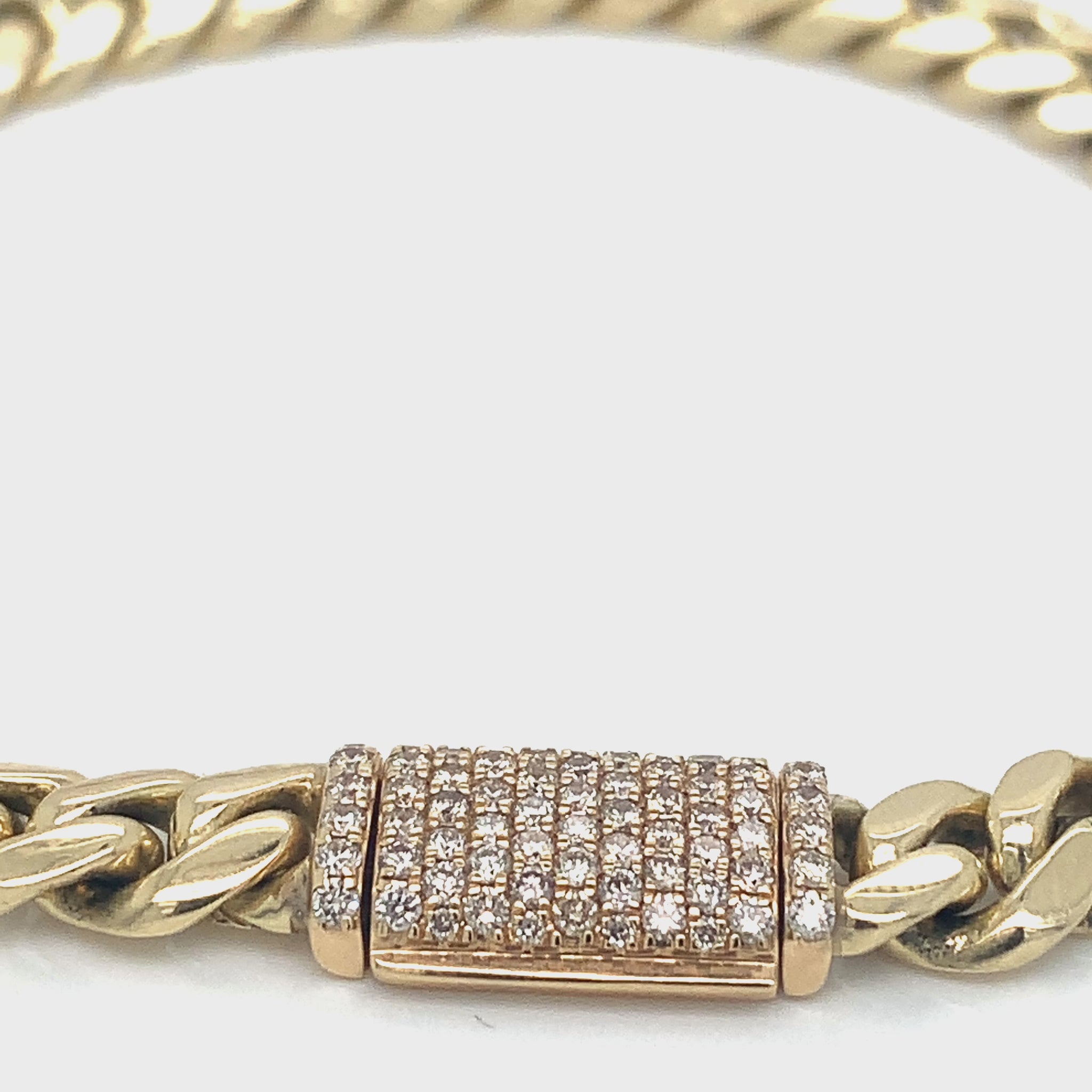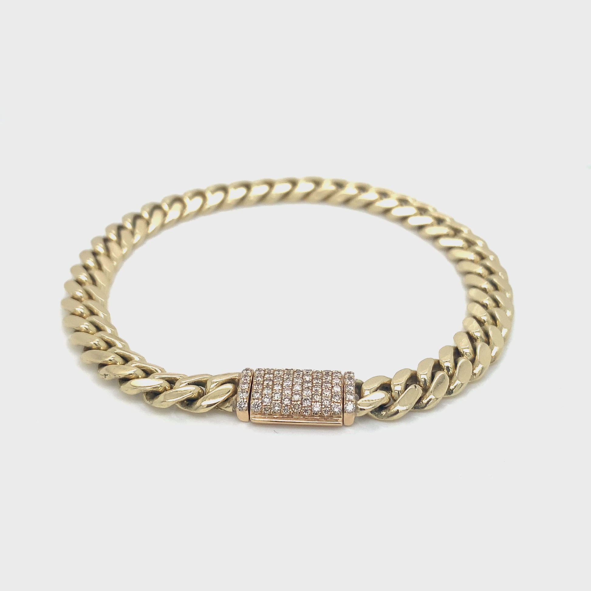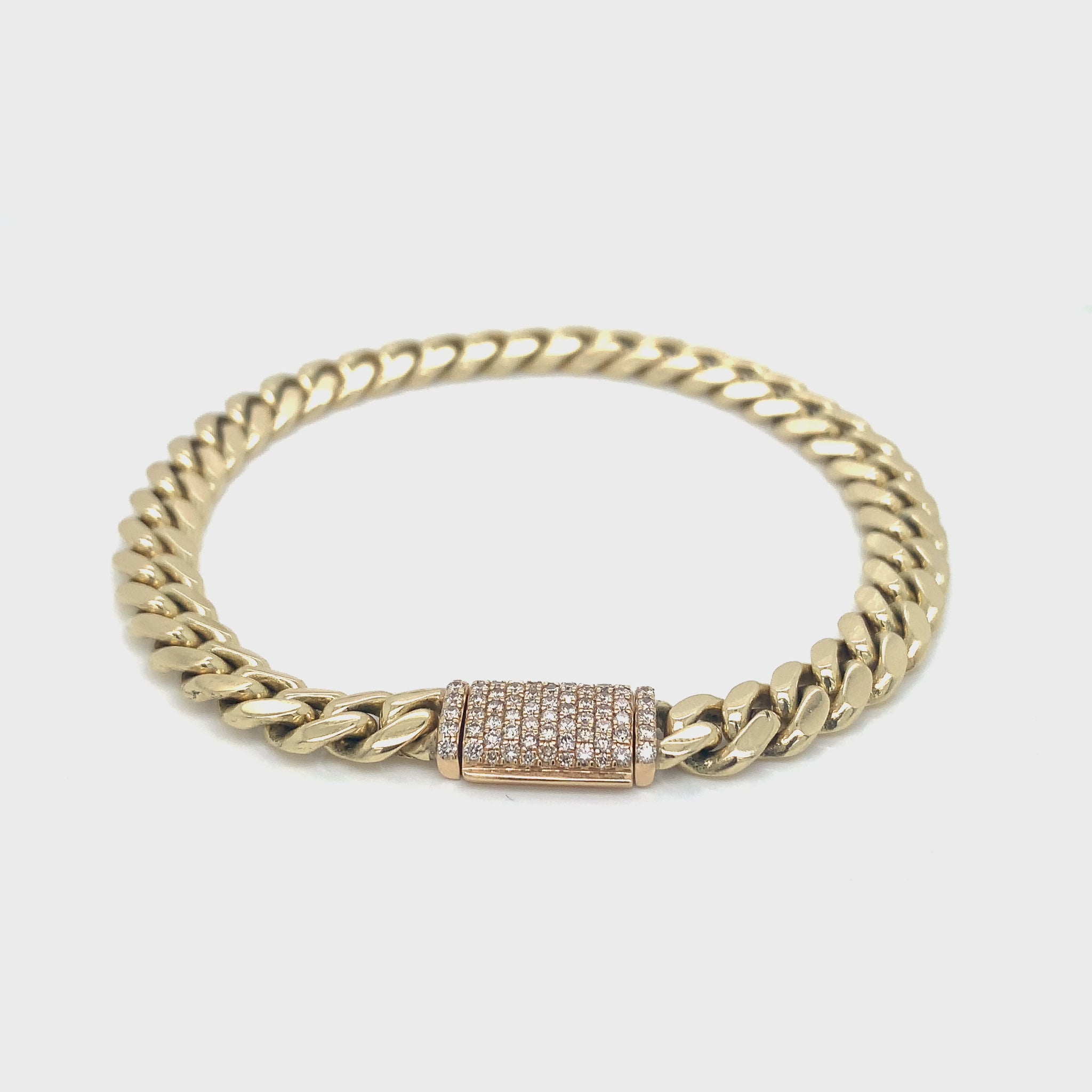 The traditional gold Cuban link bracelet is branded with a diamond lock, making this piece a beautiful addition to your collection.