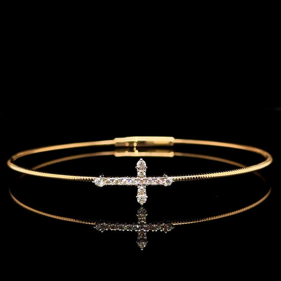 Crafted in 14kt yellow gold and set with natural diamonds this is the perfect gift for a lady. The design features a diamond cross set on a flexible bangle for a very comfortable and subtle fit.