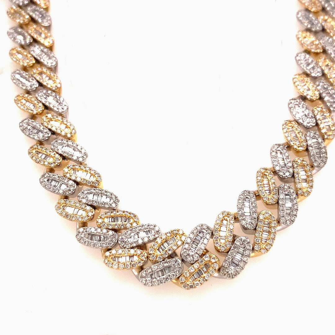 Introducing our stunning two-tone 12.5mm baguette diamond Cuban link, crafted with meticulous attention to detail. This exquisite chain features a captivating blend of yellow gold and white gold, creating a striking contrast that commands attention. Adorned with dazzling baguette diamonds, each meticulously set to perfection. Elevate any ensemble with this timeless statement piece that seamlessly combines classic elegance with modern flair.