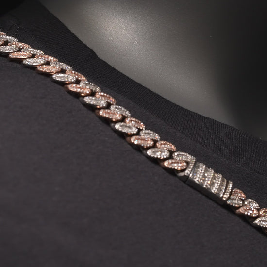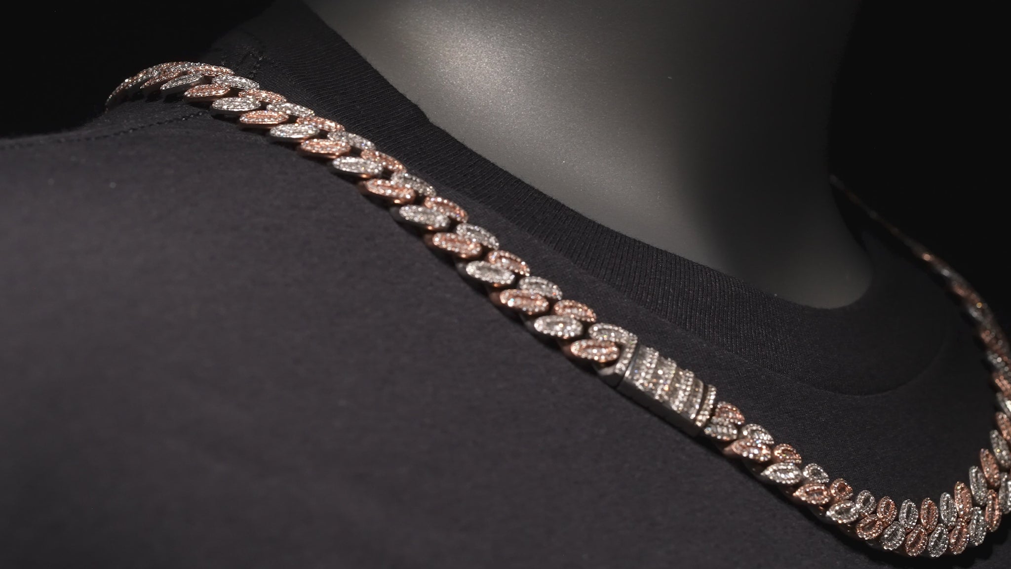 The epitome of sophistication, the Two-Tone Baguette Diamond Chain, a stunning masterpiece meticulously crafted to captivate every admirer's gaze. Crafted in the finest 10-karat rose and white gold, this exquisite piece symbolizes the seamless fusion of grace and innovation. At its heart lies a staggering 22.00 carats of baguette diamonds, 24-inch length, this chain effortlessly elevates every collection.