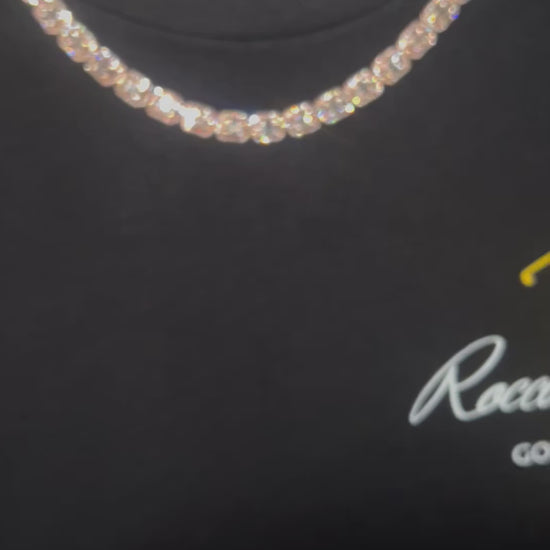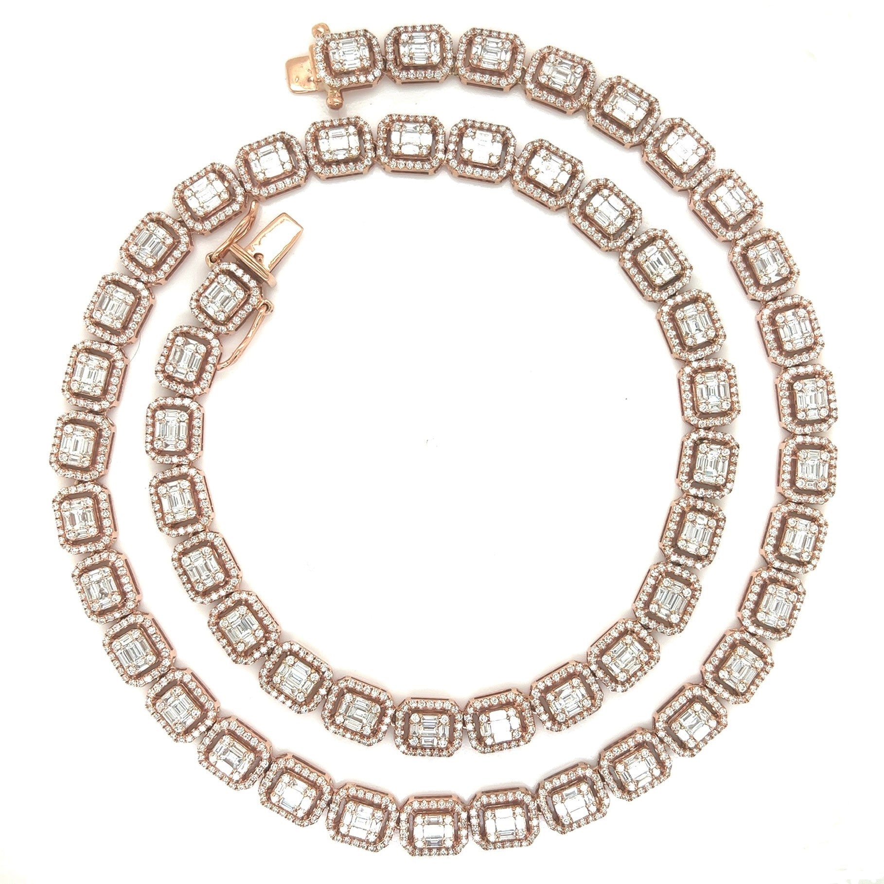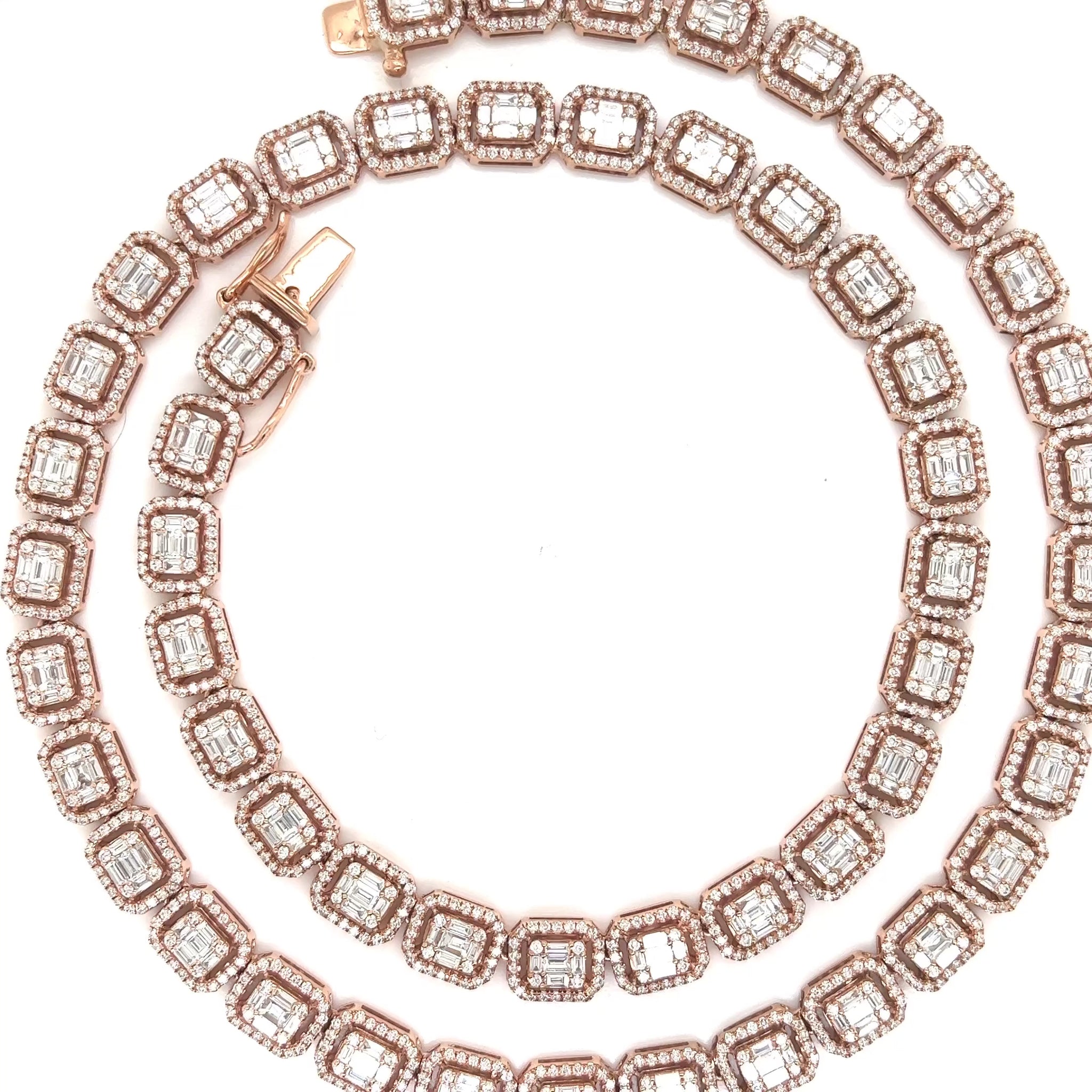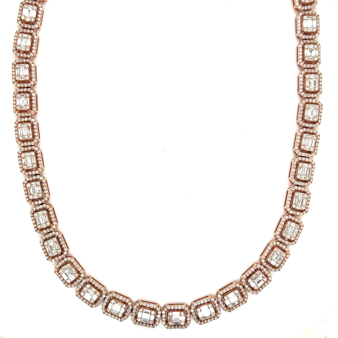 Discover the epitome of elegance with our stunning 20-carat Diamond Tennis Chain, expertly crafted for the discerning connoisseur. Set in 10-karat rose gold, each 8mm link is encrusted with VS1 diamonds, creating a continuous line of brilliance that captures and reflects light with every movement. Weighing 49.3 grams, this luxurious chain combines substantial presence with unparalleled elegance.
