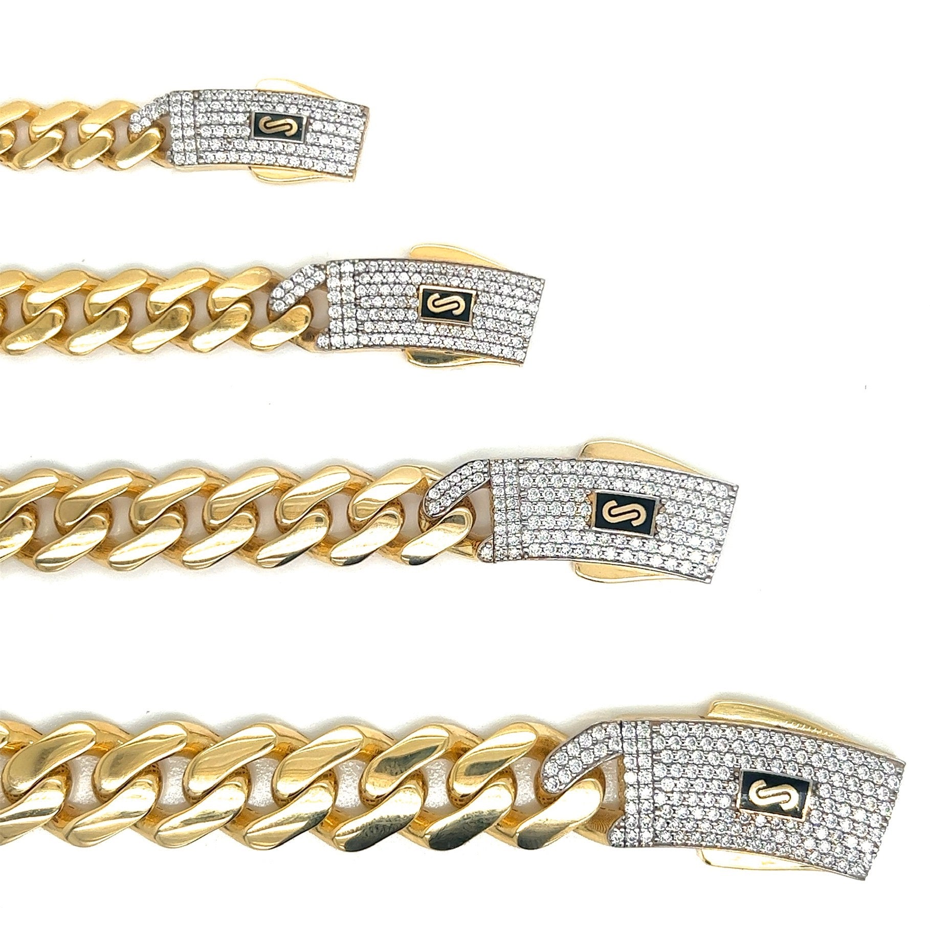 Our Monaco Cuban Chain captivates with its sapphire crystal lock, intricately detailed and adorned with white crystal stones. This captivating focal point exudes refined beauty, enhancing the overall appeal of the chain.