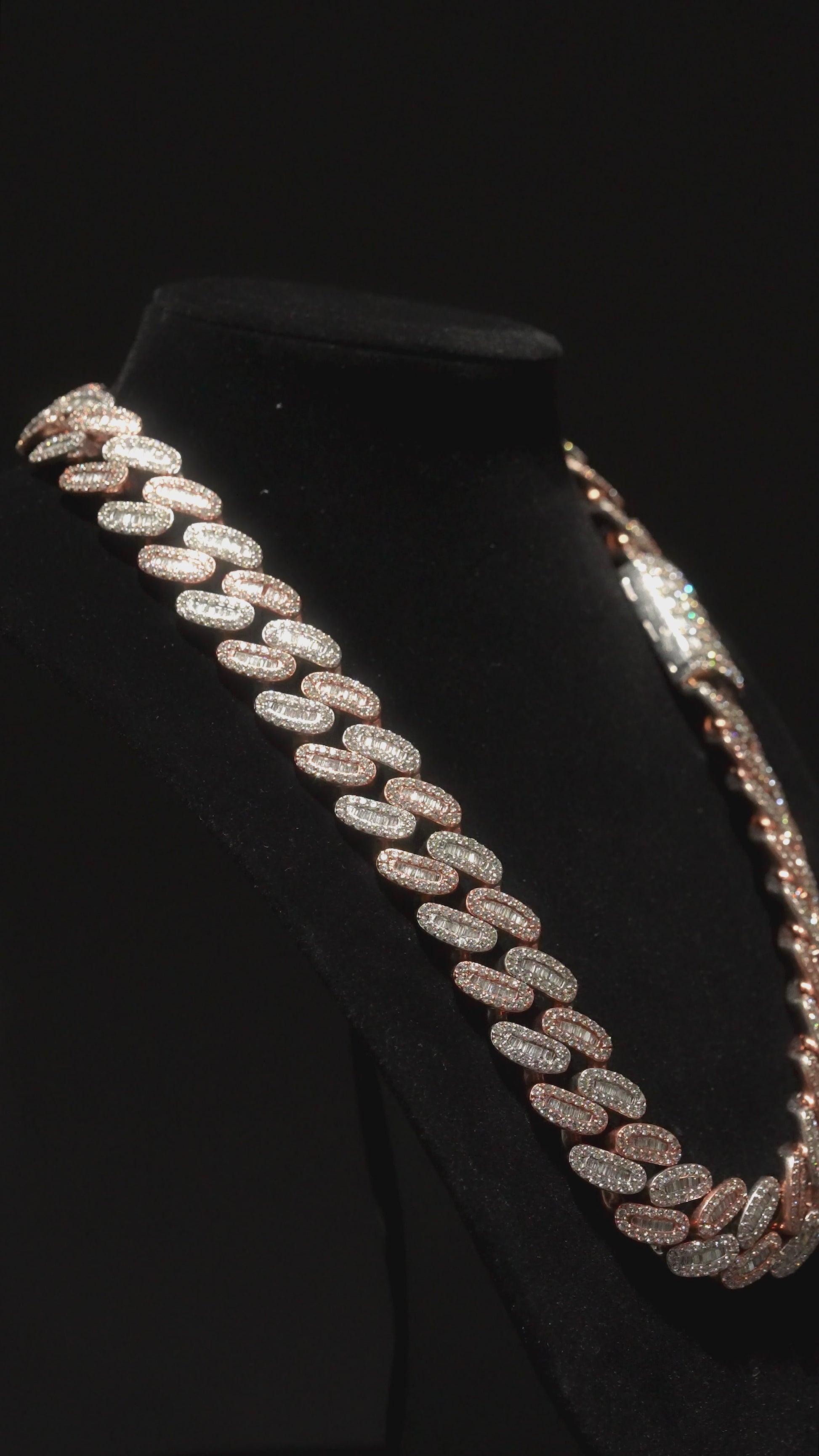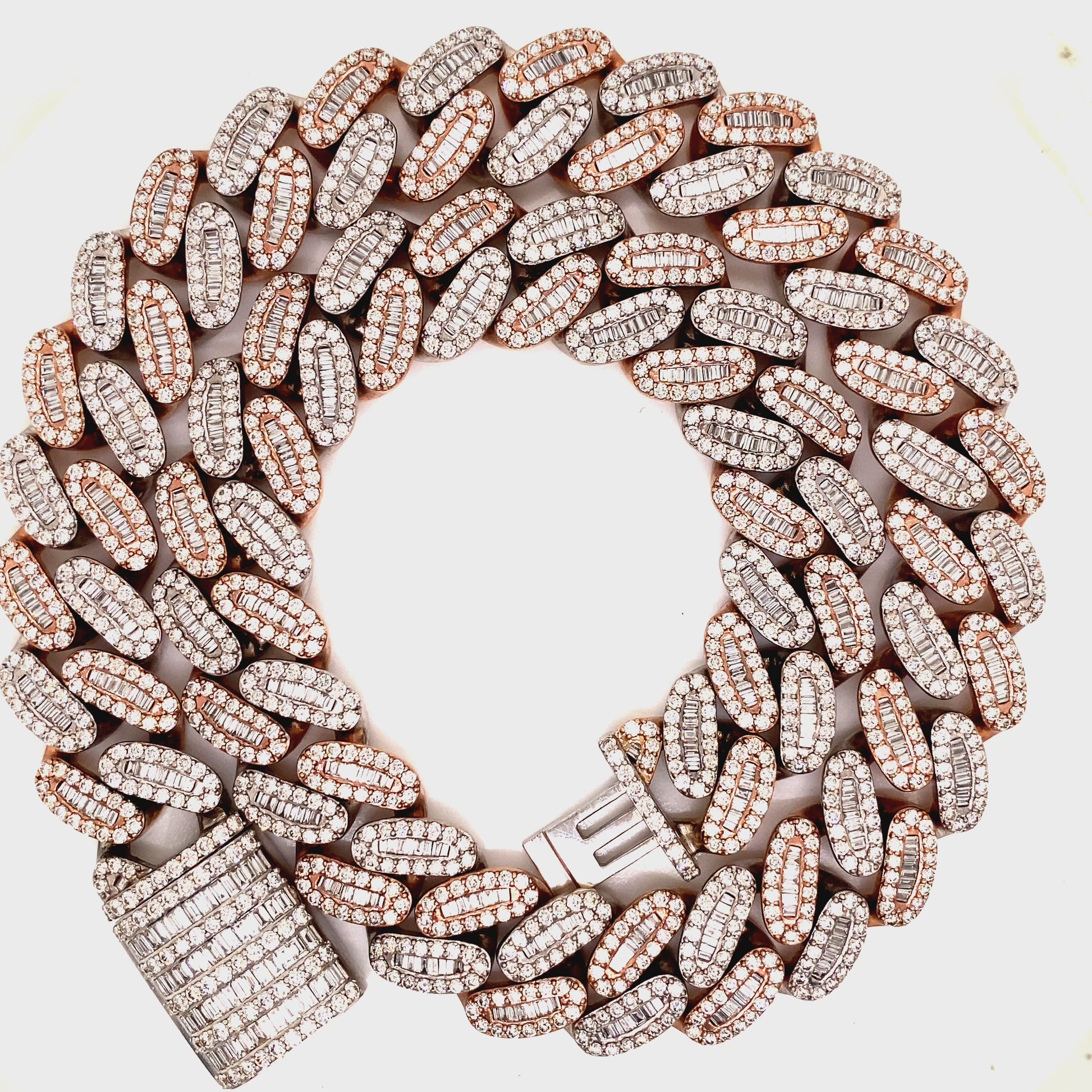 Newly designed bust down cuban link. We put some of the best diamonds known to man in this chain. All the diamonds were hand selected to insure the best possible, consistent shine throughout. The necklace itself is solid 14K two tone rose and white gold. At 18MM, We made this chain ridiculously thick. We also made the necklace only 18", shorter than traditional chains at this millimeter size. This chain is not for everyone.
