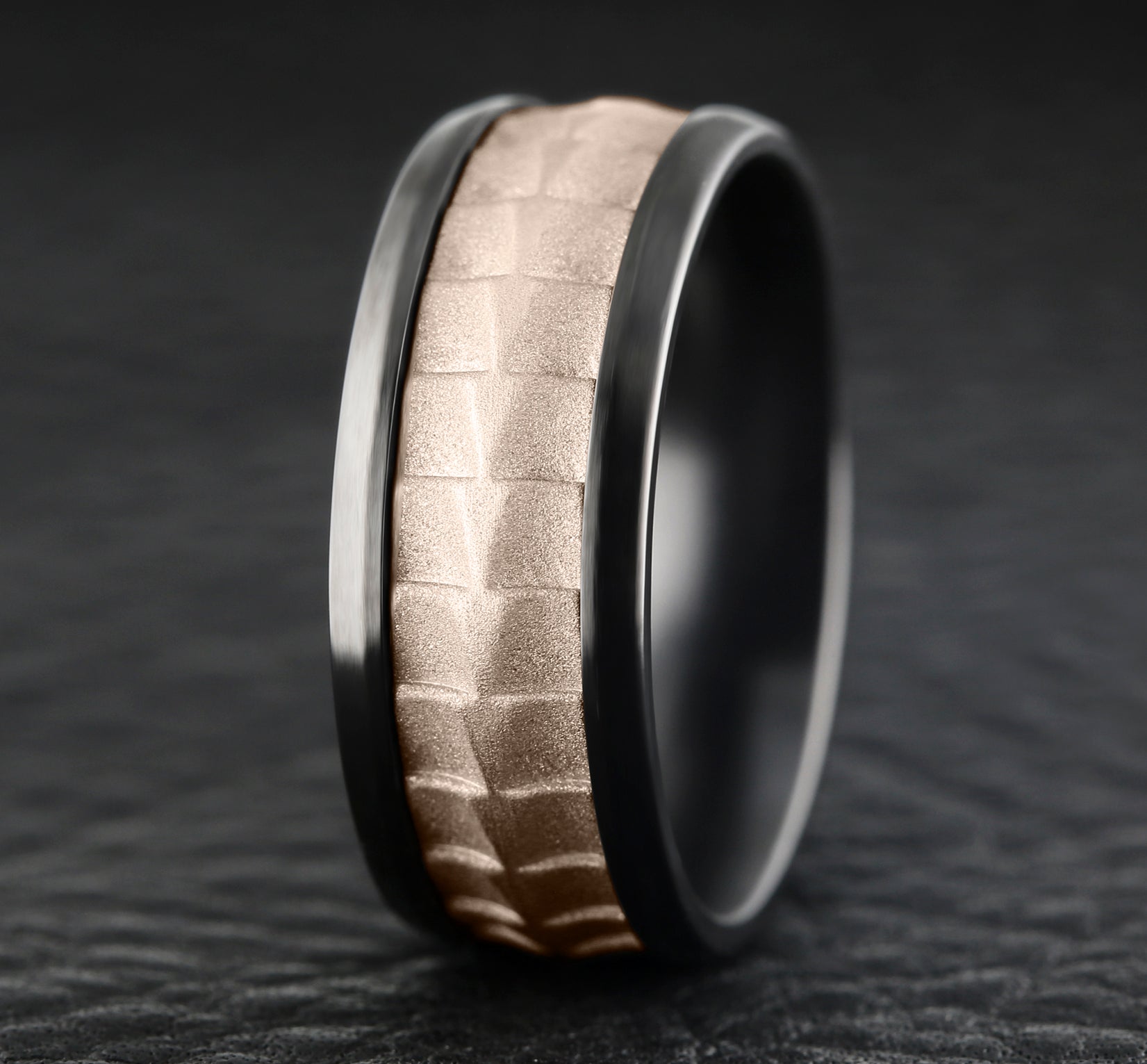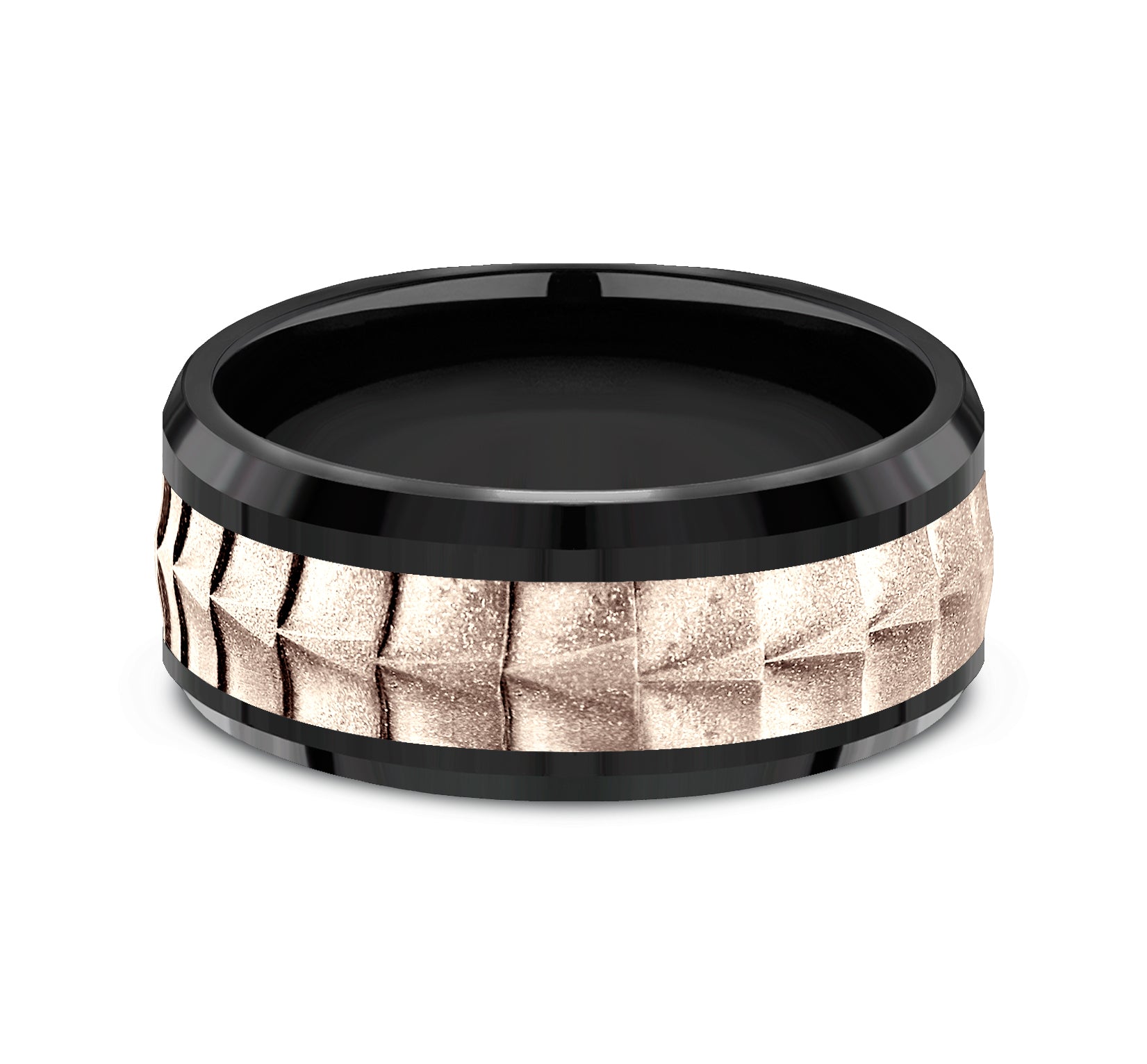 9mm, Comfort fit Black Titanium and 14K Rose Gold Crocodile skin patterned center, polished bevel edges
