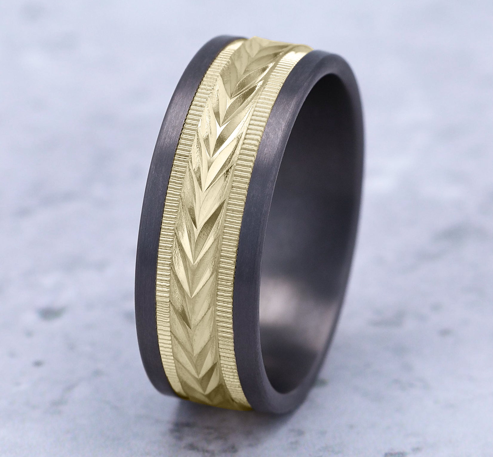 8mm, Comfort fit Grey Tantalum and 14K Yellow Gold Wheat pattern with milgrain detail, straight edges