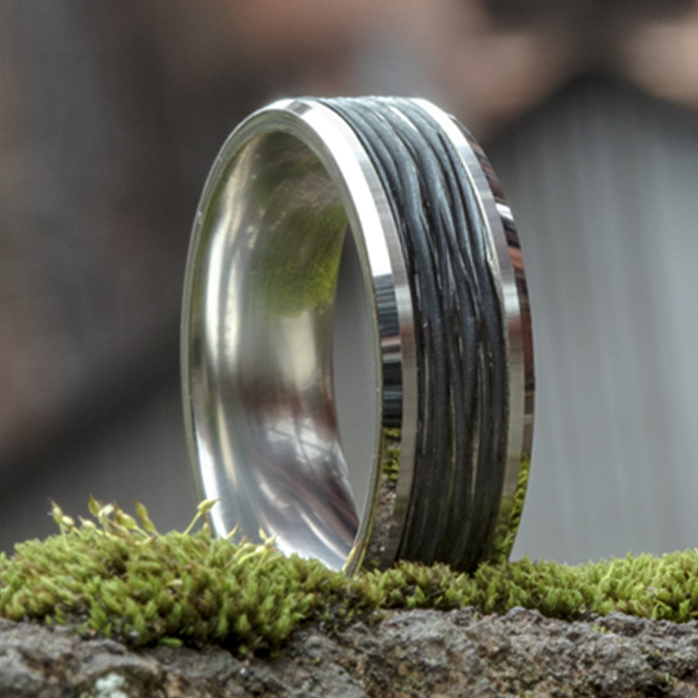 8mm, Comfort fit 14K White Gold and Black Titanium Horizontal bark patterned center, polished bevel edges