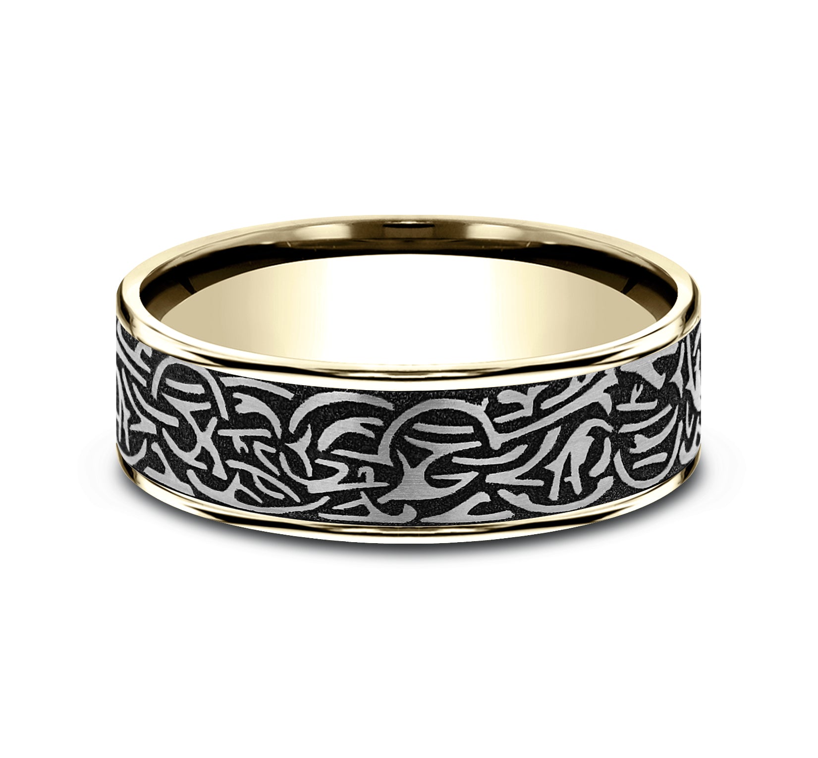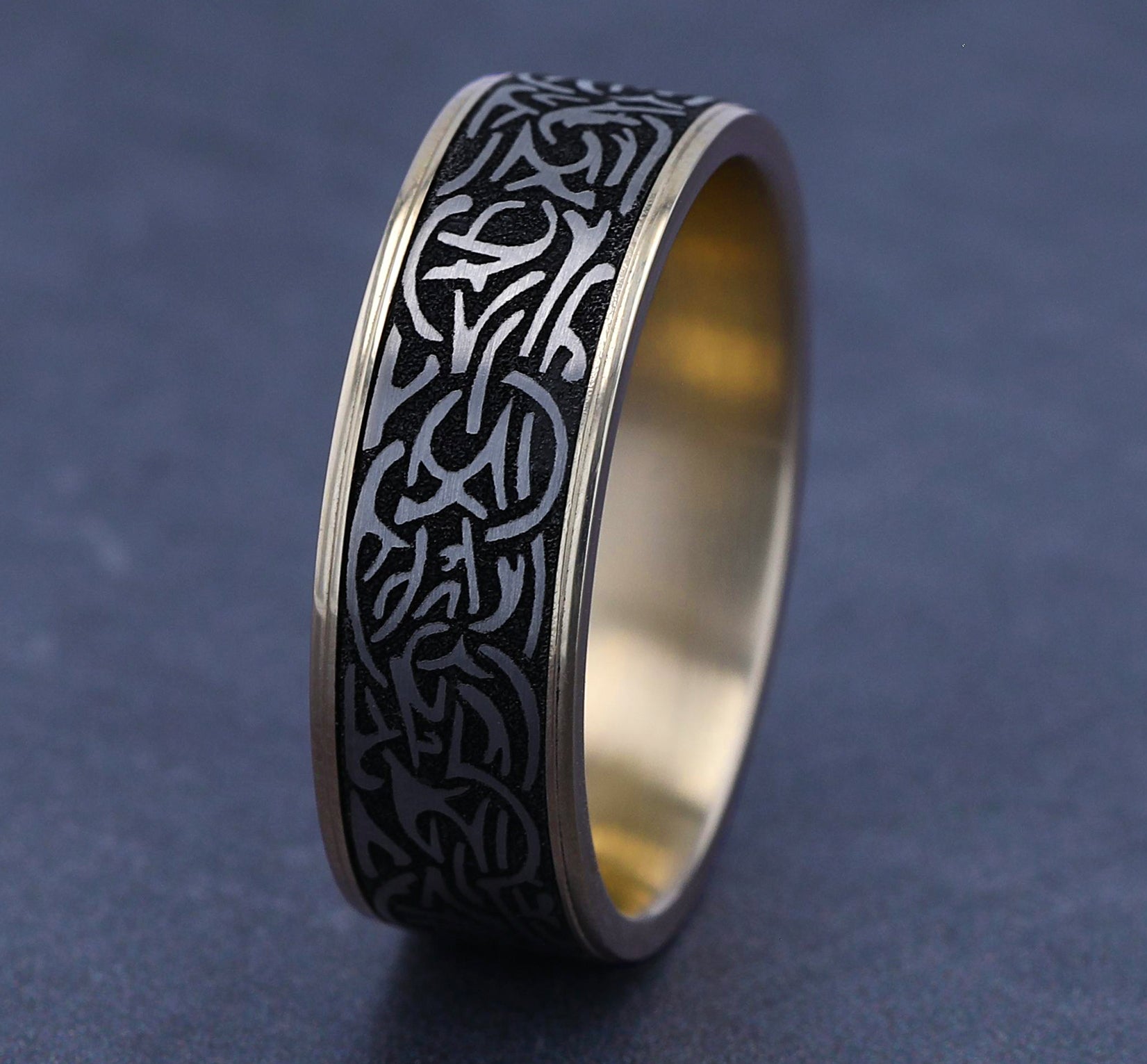 7.5mm, Comfort fit 14K Yellow Gold and Grey-Black Titanium Thor's hammer inspired design, thin edges