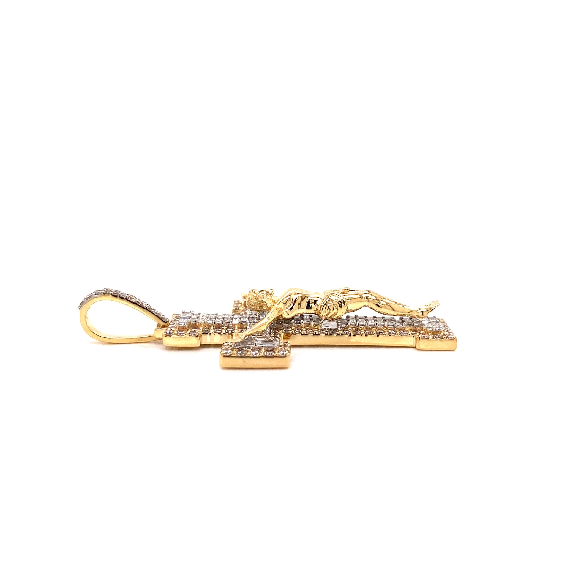 This 10K gold diamond modern cross pendant is stylish, elegant, and great for everyday wear. Finely detailed with 4 CTW in diamond, this modern cross has a baguette-styled diamond set for a sophisticated look. This diamond crucifix is one-of-a-kind.