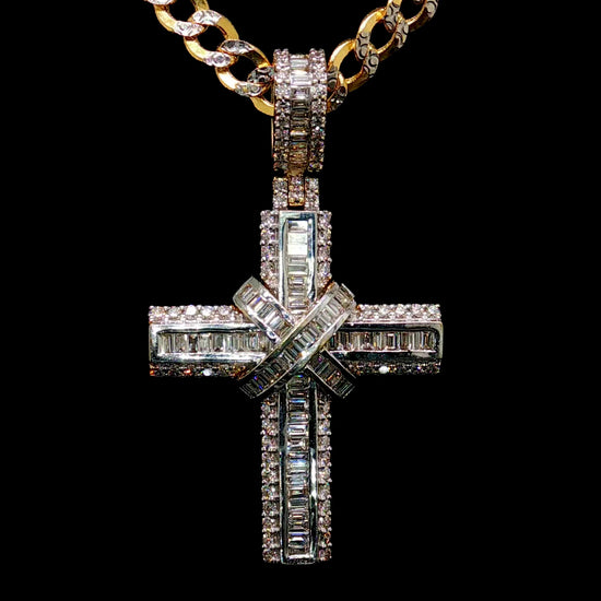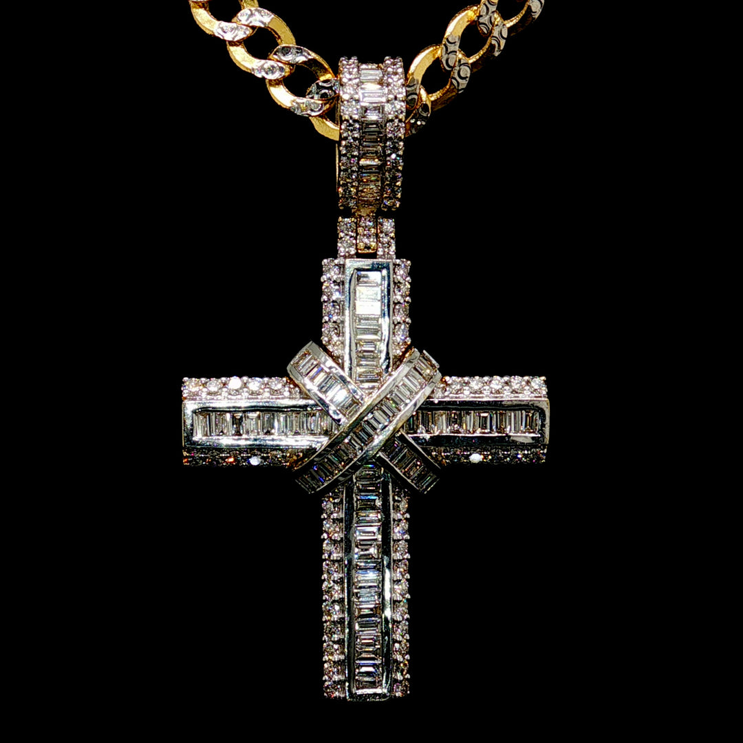 This Yellow Gold Cross Pendant features a clean X design at the center set with baguette and round brilliant cut diamonds. Bright and structured it delivers strong shine with a modern look.