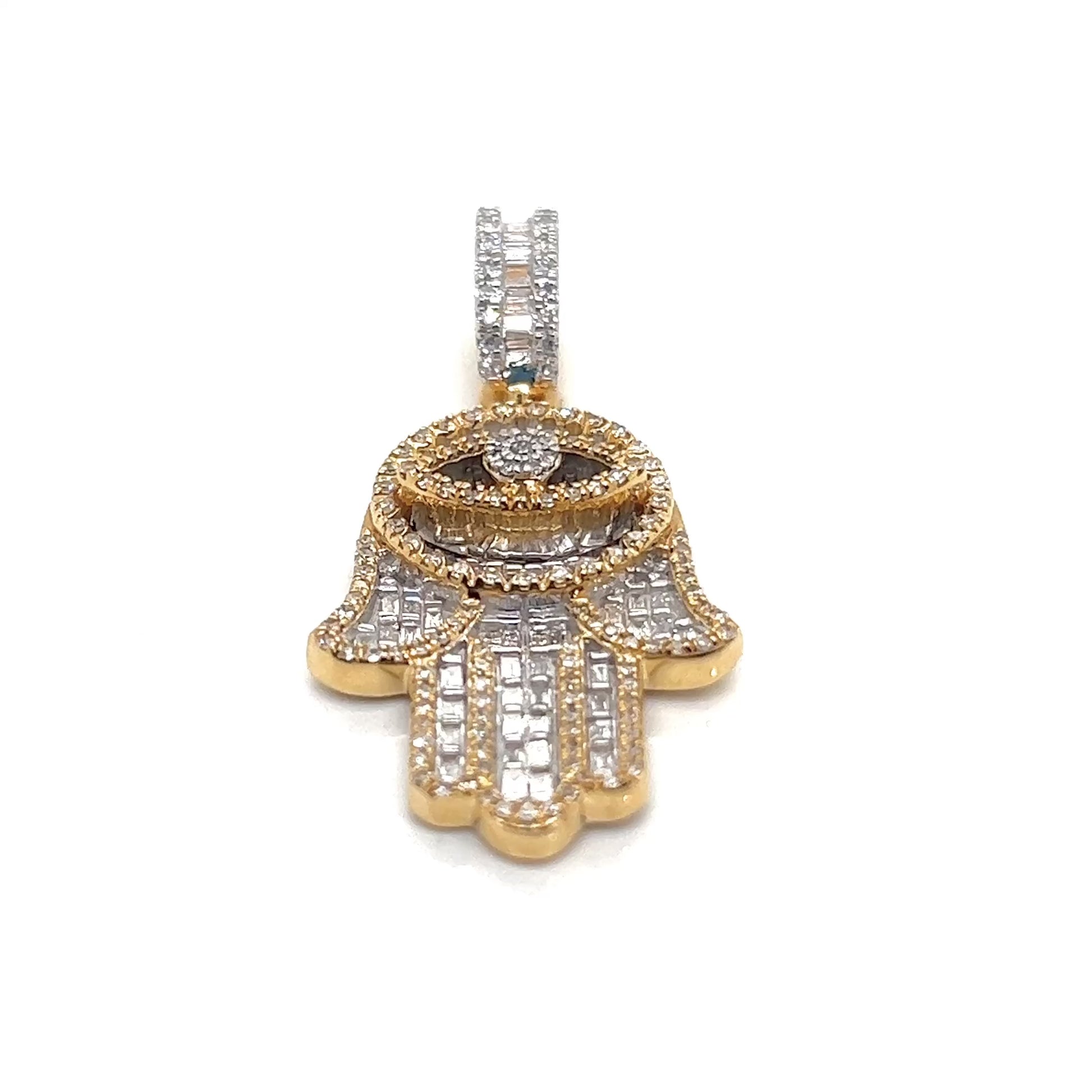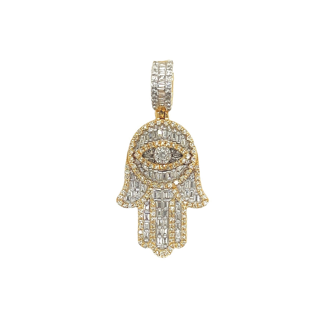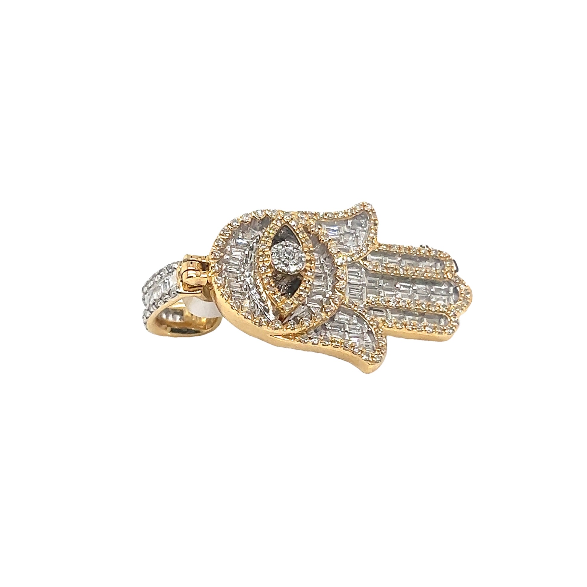 Express your style with the Hamsa Evil Eye pendant, crafted in radiant yellow gold and embellished with round and baguette VS clarity diamonds. Showcasing a striking evil eye motif at its center, this pendant blends classic protection with exquisite sparkle for a truly captivating accessory.