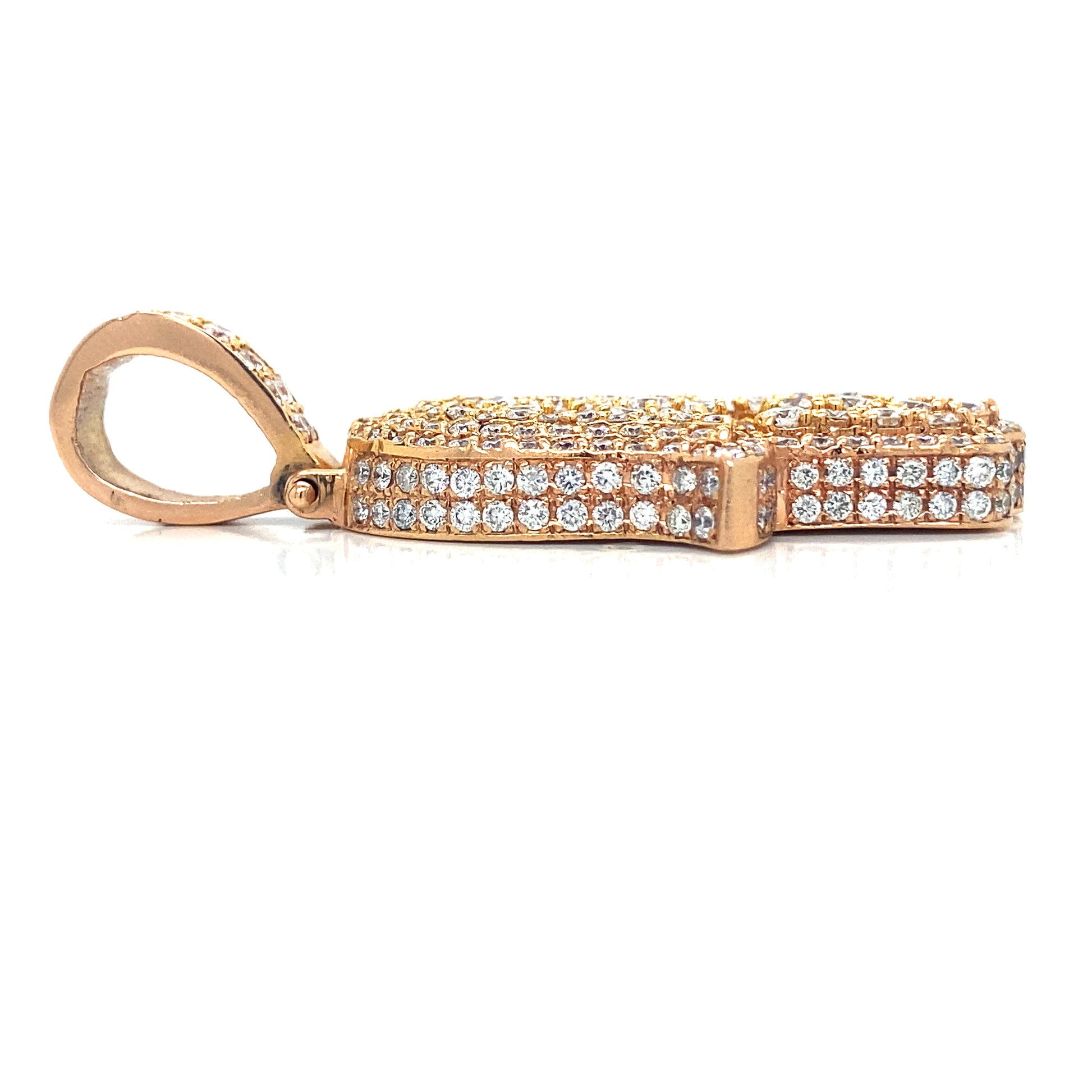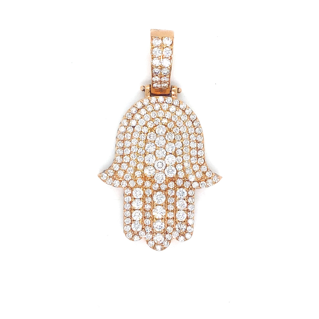 The Hamsa pendant made to perfection. This piece is larger, heavier and more flooded than most gold pendants out there. We used 3 different sizes of natural VS clarity diamonds on three different levels for the front of the piece to give a more detailed design with sizes ranging from 0.05 to 0.10pt. We even paved the sides with diamonds to completely flood this solid backed hamsa.