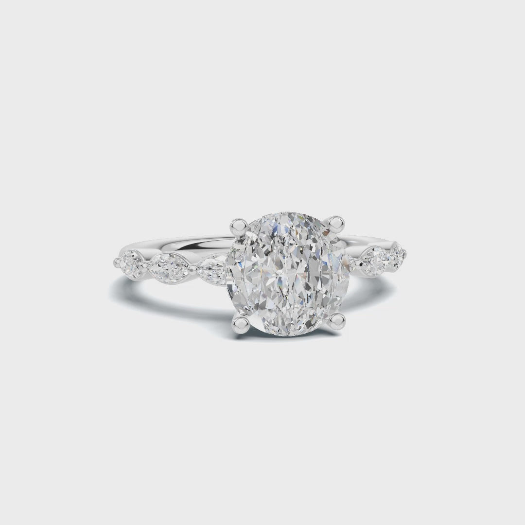 The band features a graceful garland of marquise-cut diamonds, flanking the center stone like delicate leaves on a vine. The contrast between the classic round diamond and the unique marquise accents creates a captivating design that is both elegant and full of personality.