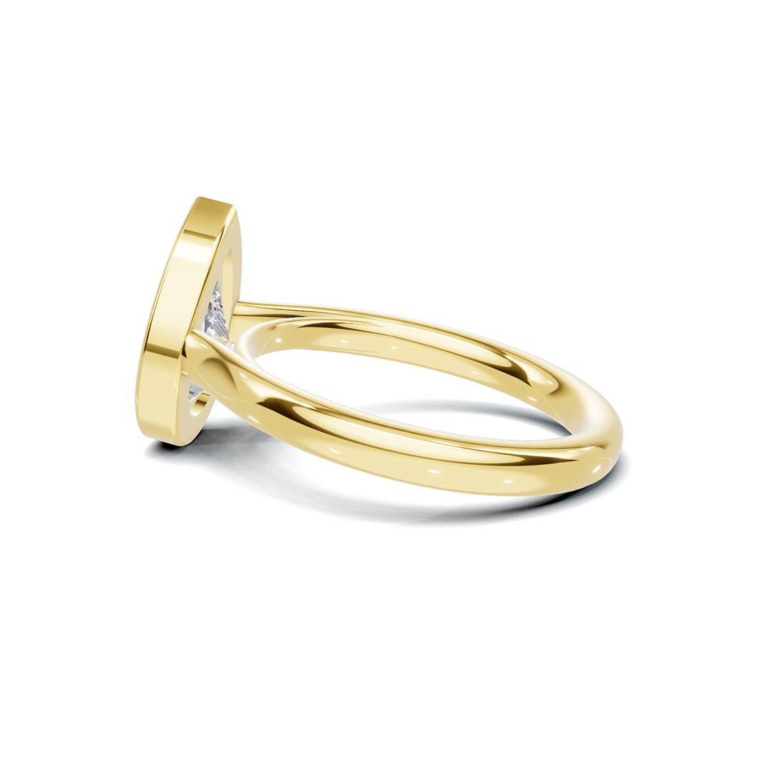 The warm glow of the yellow gold band creates a beautiful contrast, flowing seamlessly into the bezel to create a smooth, contemporary profile. This minimalist design is perfect for the modern bride who values both style and security, as the bezel setting offers unparalleled protection for the center stone.