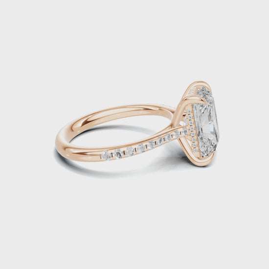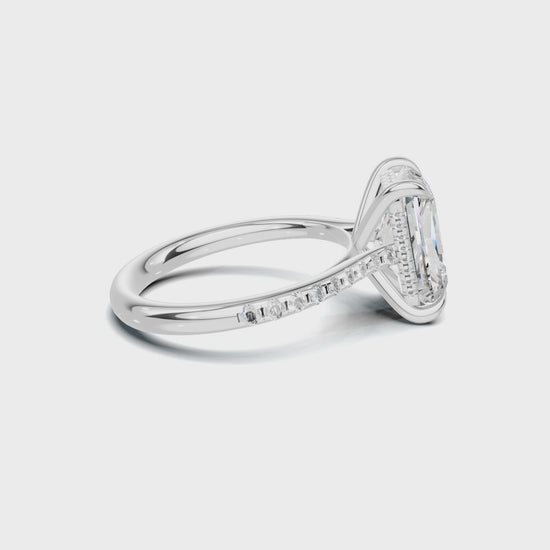 The brilliance continues onto the delicate band, which shimmers with a row of meticulously set pavé diamonds that gracefully lead the eye toward the center. For a final touch of breathtaking beauty, a hidden halo of diamonds is nestled beneath the main stone, ensuring a surprising sparkle from the side profile. This ring is a perfect harmony of radiant elegance and sophisticated design.