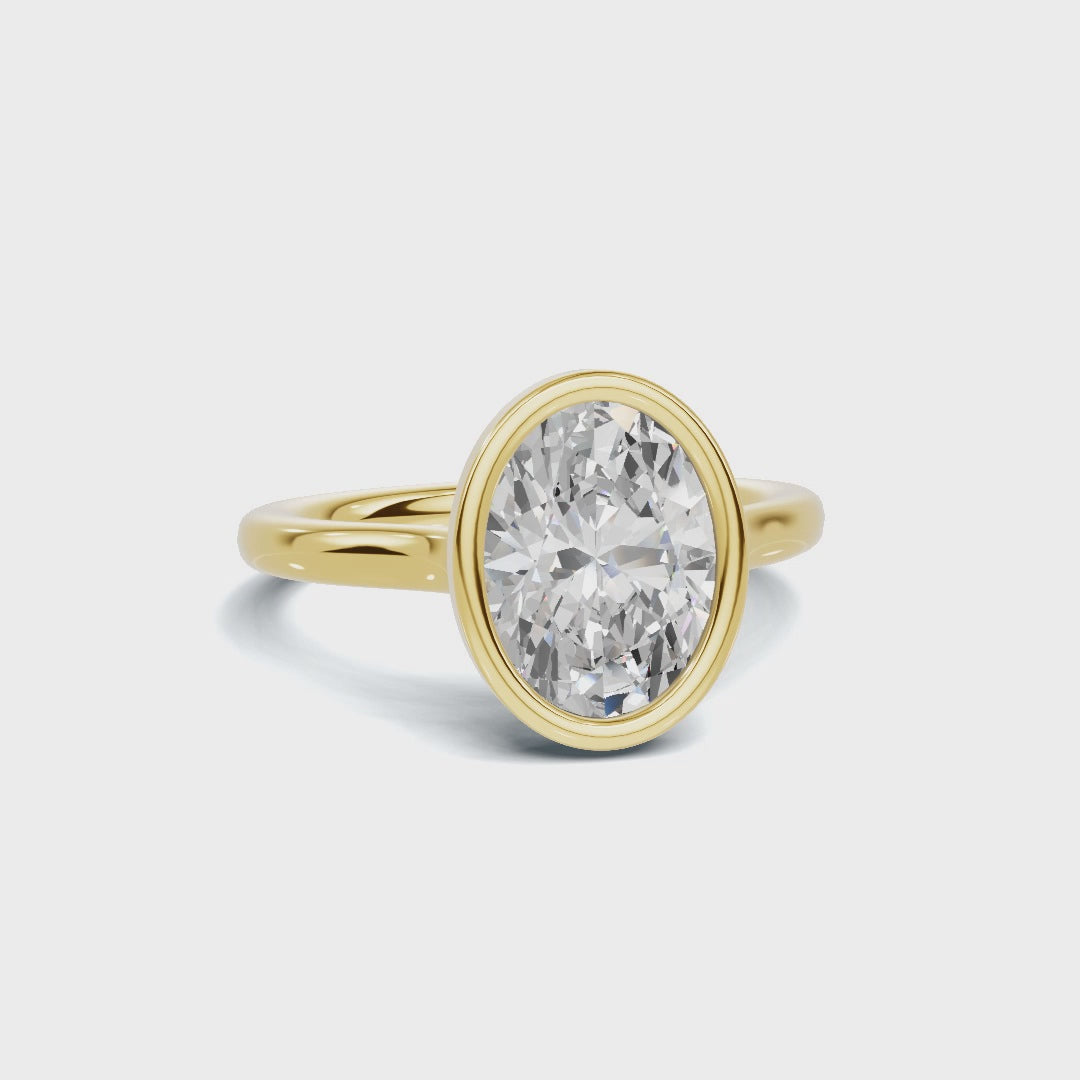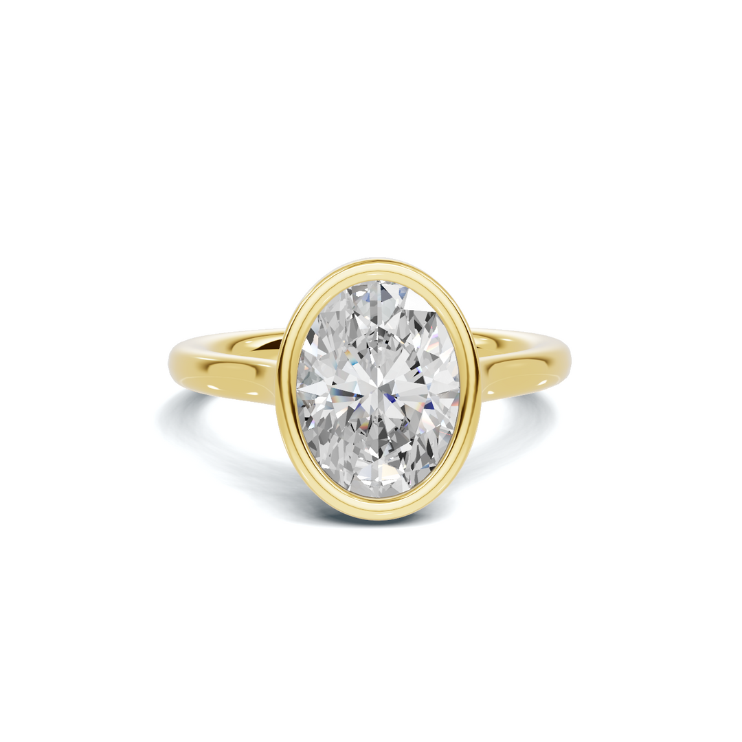 A masterpiece of modern design, this bezel-set solitaire ring exudes an aura of understated confidence and clean, contemporary style. The centerpiece is a stunning 2.21 carat oval-cut lab diamond, whose brilliant facets are perfectly framed by a sleek ribbon of solid gold. This full bezel setting not only creates a bold, minimalist look but also offers the ultimate in security for your precious stone.