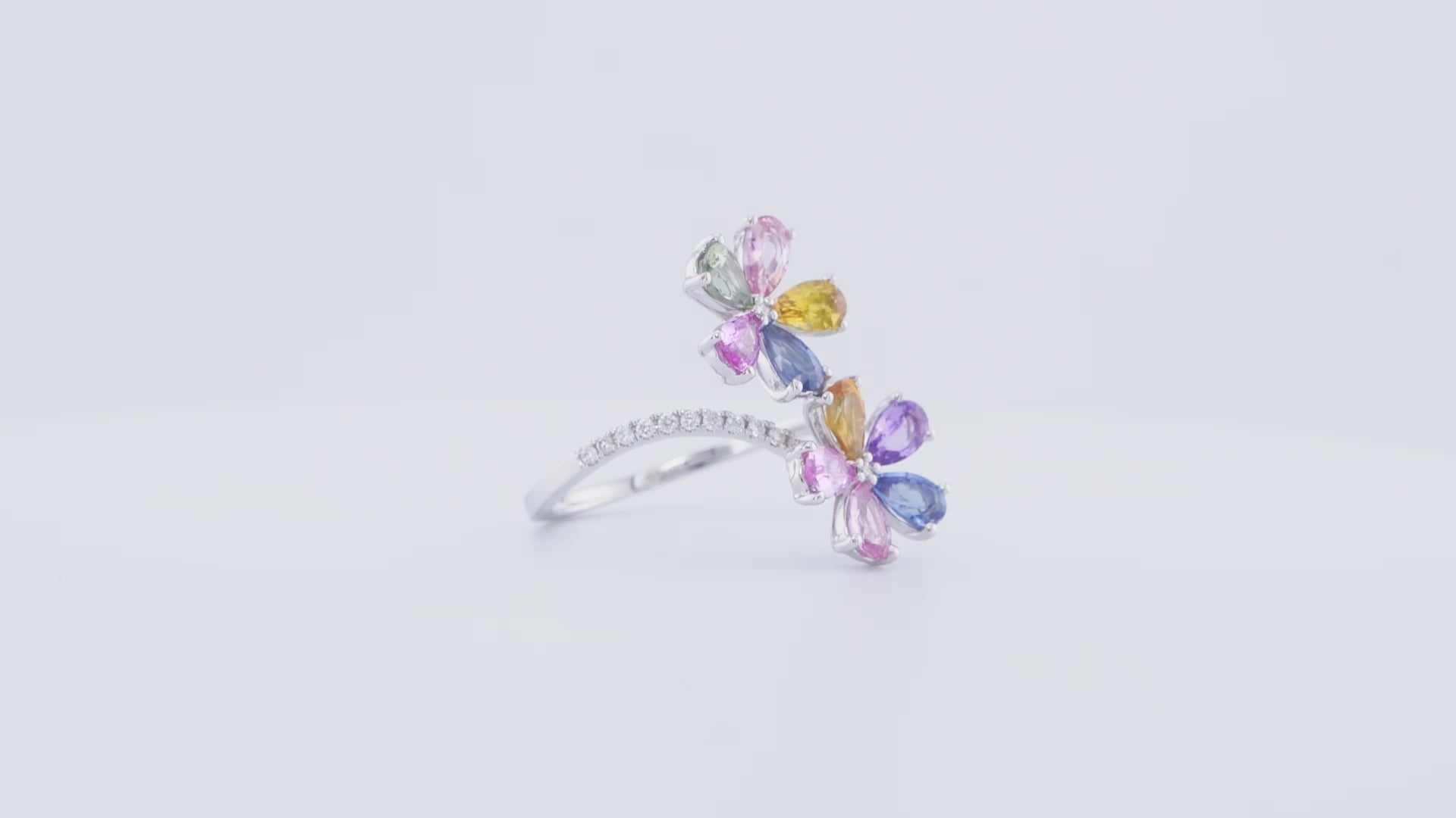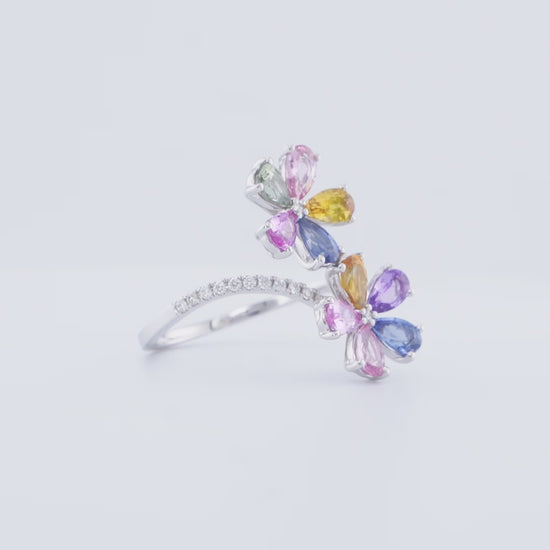 Indulge in the opulent beauty of our Multi Sapphire Flower Ring. Crafted with an assortment of exquisite sapphires, this ring is a stunning display of nature's splendor. The flower design exudes elegance and sophistication, making it the perfect addition to your luxury jewelry collection. Elevate any outfit with this exclusive piece.