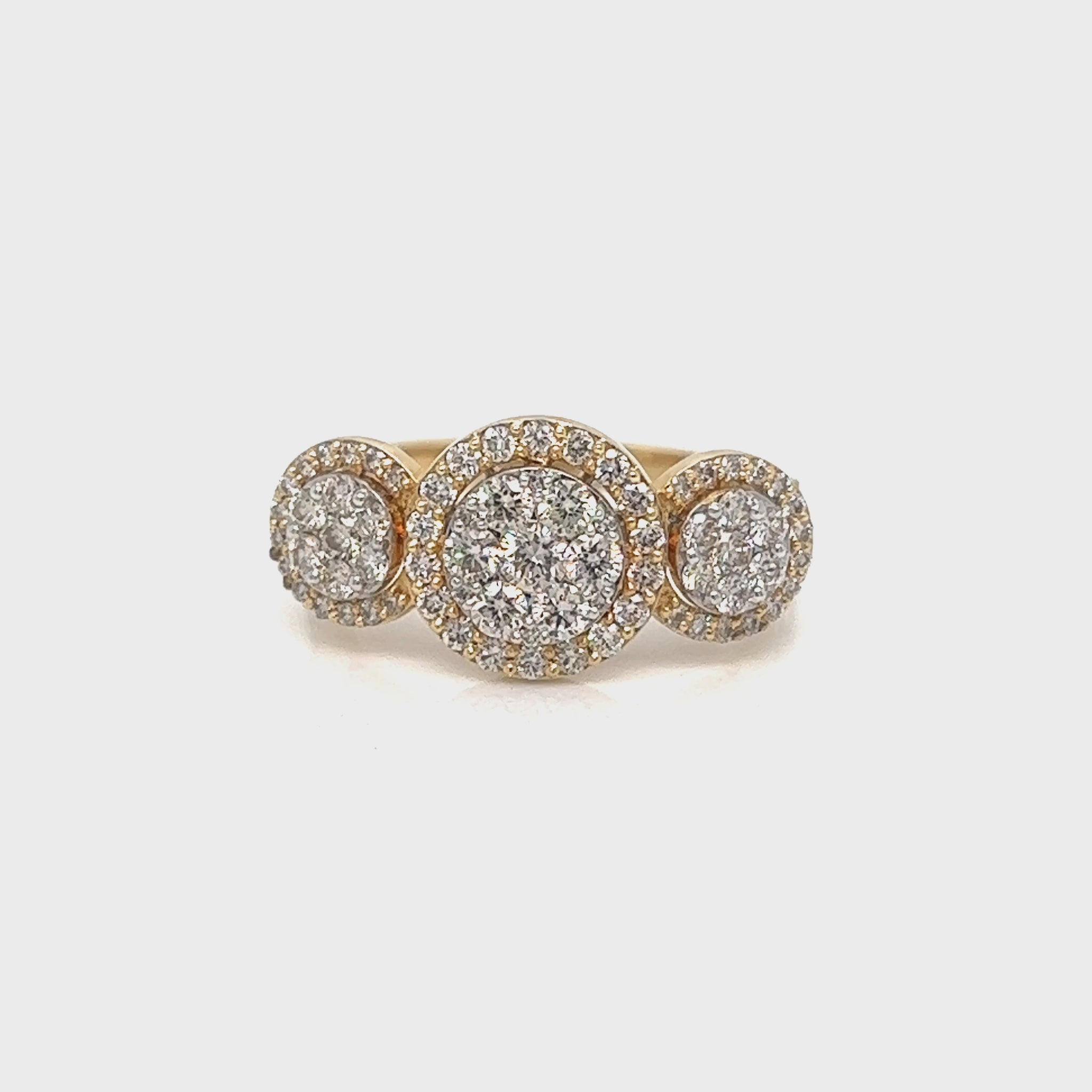 Made with nearly 1.5 carats of VS clarity diamonds and featuring a captivating trio of sparkling diamond clusters, each encircled by a halo of brilliant G/H color diamonds. Whether worn as an engagement ring or a special statement piece, this ring is designed to capture hearts.