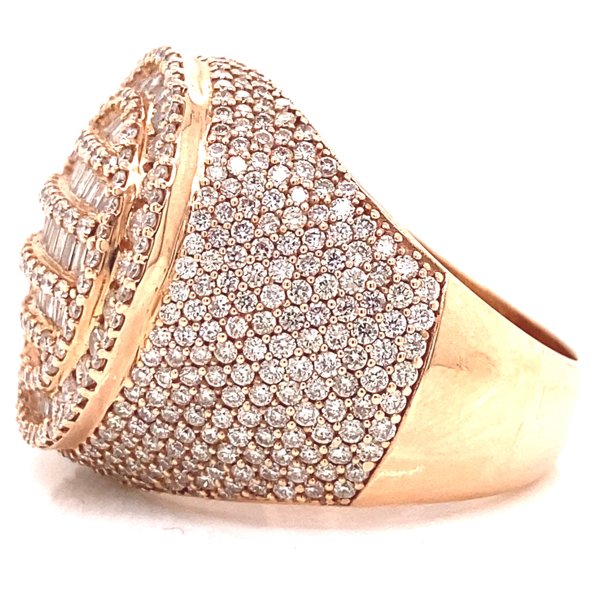 This 14K rose gold diamond cake ring is intricately built with 4 CTW in VS1 clarity diamonds. This ring makes a perfect gift or addition to a diamond ring collection.