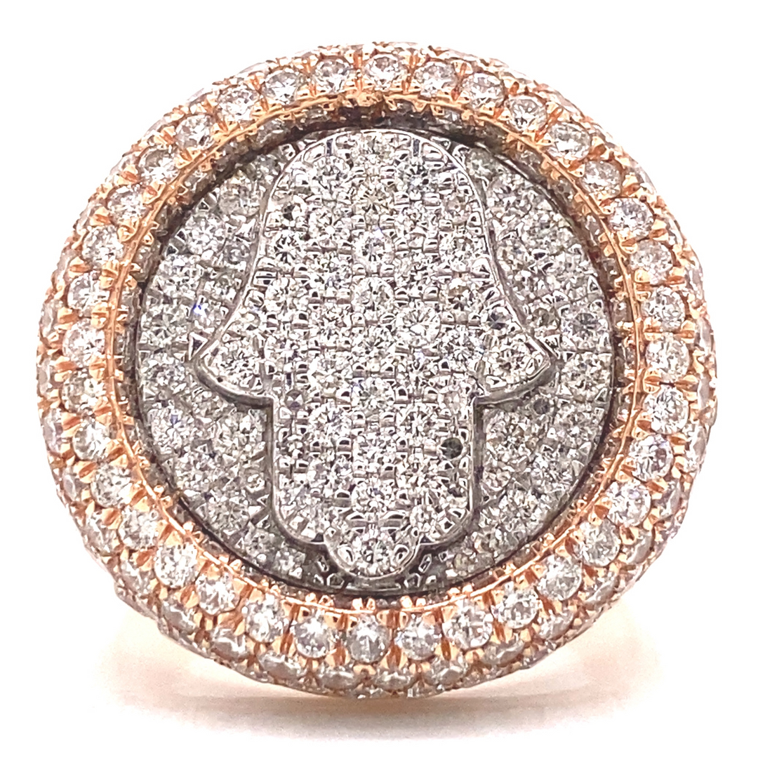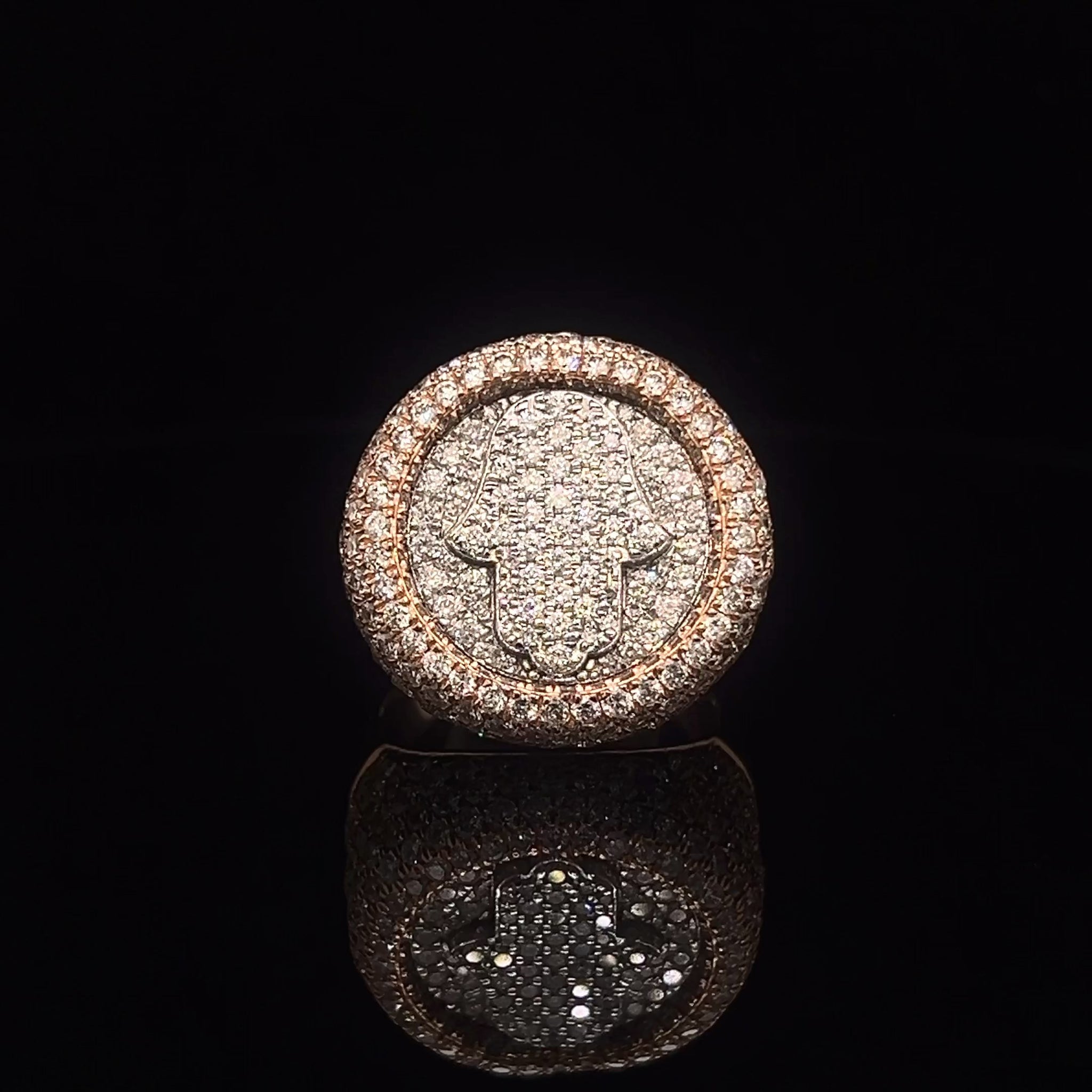 This rose gold two-tone Hamsa ring features 7 CTW in VS1 clarity diamonds. Made for diamond lovers this ring showcases protection and peace on your finger.