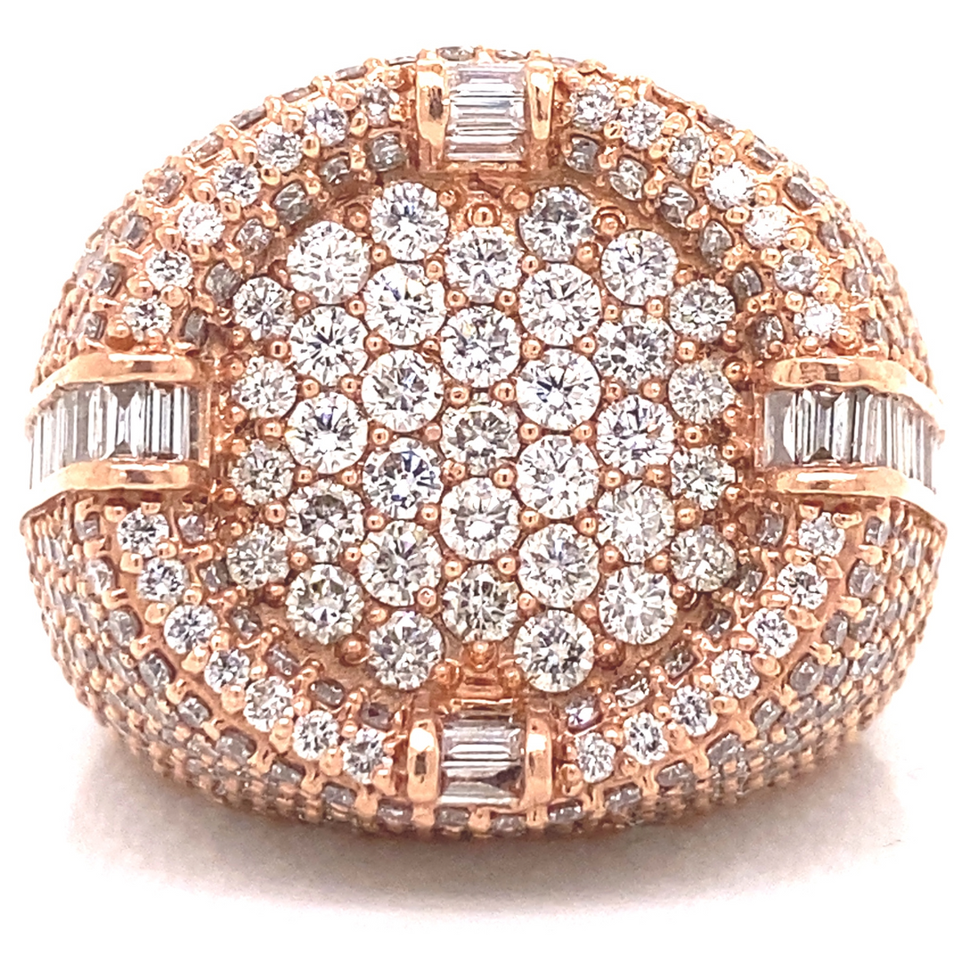 A volcano Handcrafted into solid 14K rose gold. This pinky ring showcases 6.50 CT of high clarity natural diamonds that reflect light into fire.