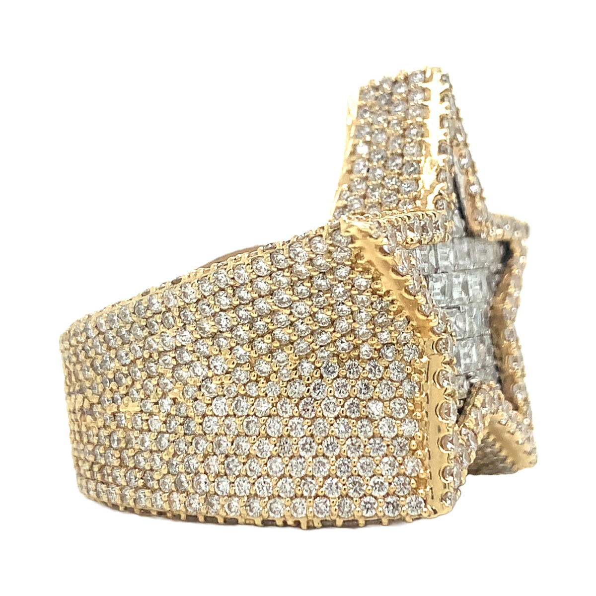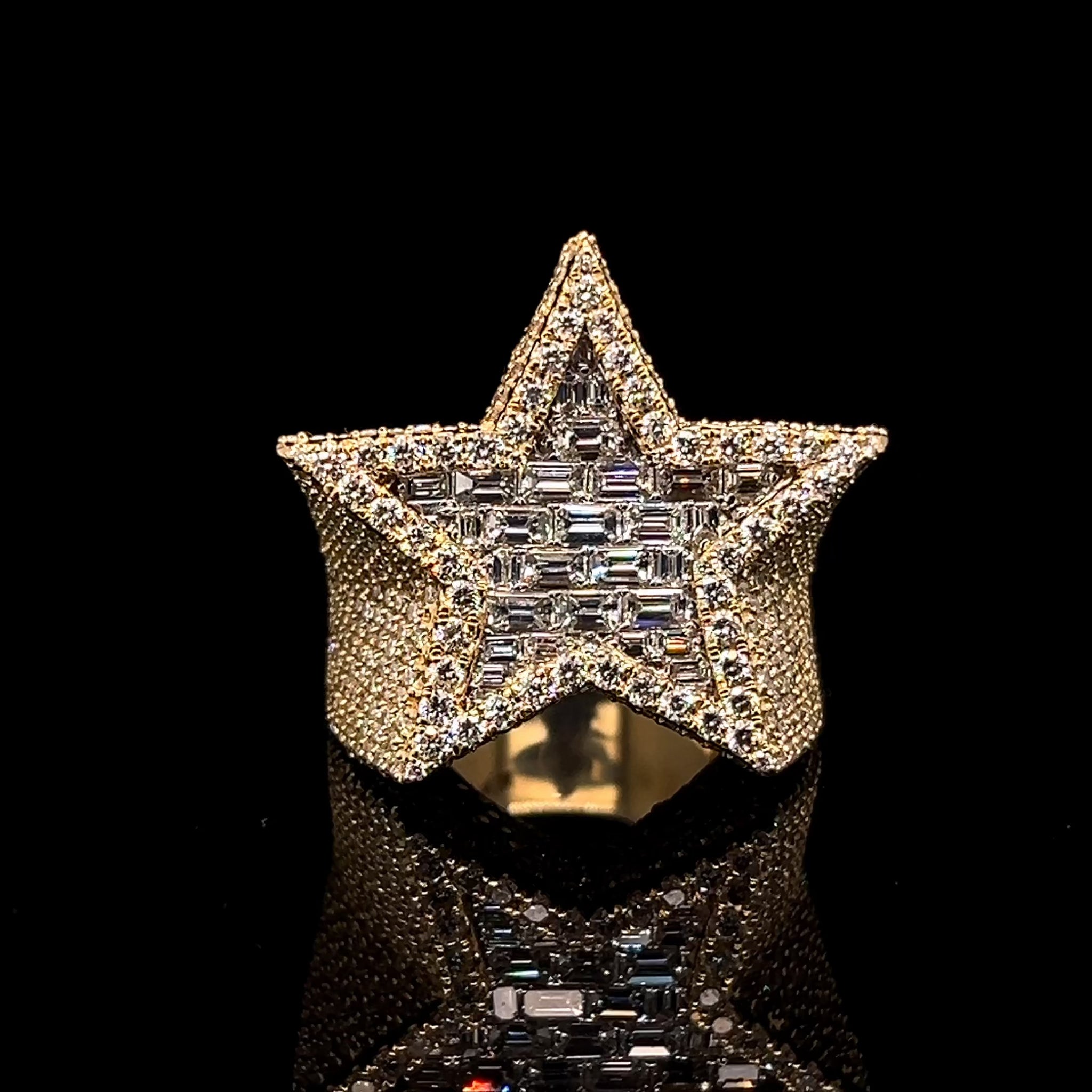 One of the largest rings in our collection, truly designed for someone larger than life. Large sized emerald shaped diamonds were hand selected and individually placed within the center of the star. They are incased with pave set round shaped VVS clarity diamonds.