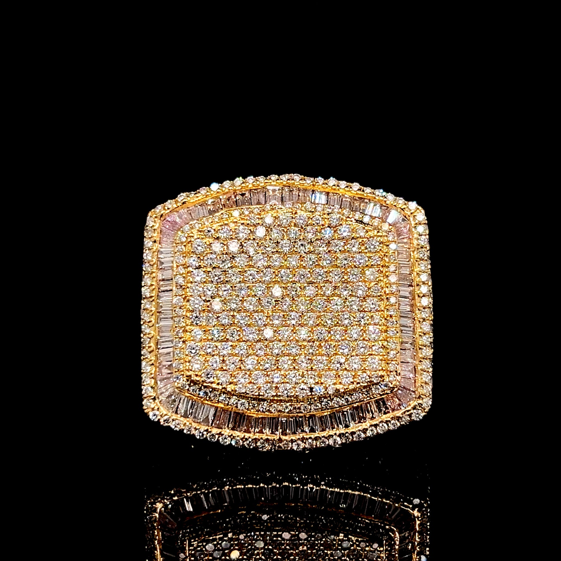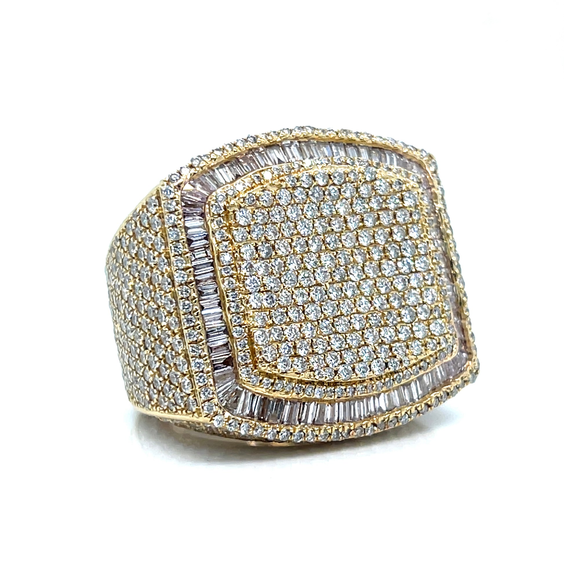 This stunning ring is crafted in 14kt gold and features approximately 9 carats total weight of VS1 diamonds. The design showcases a luxurious pave-set diamond centerpiece, framed by a halo of baguette and round diamonds.