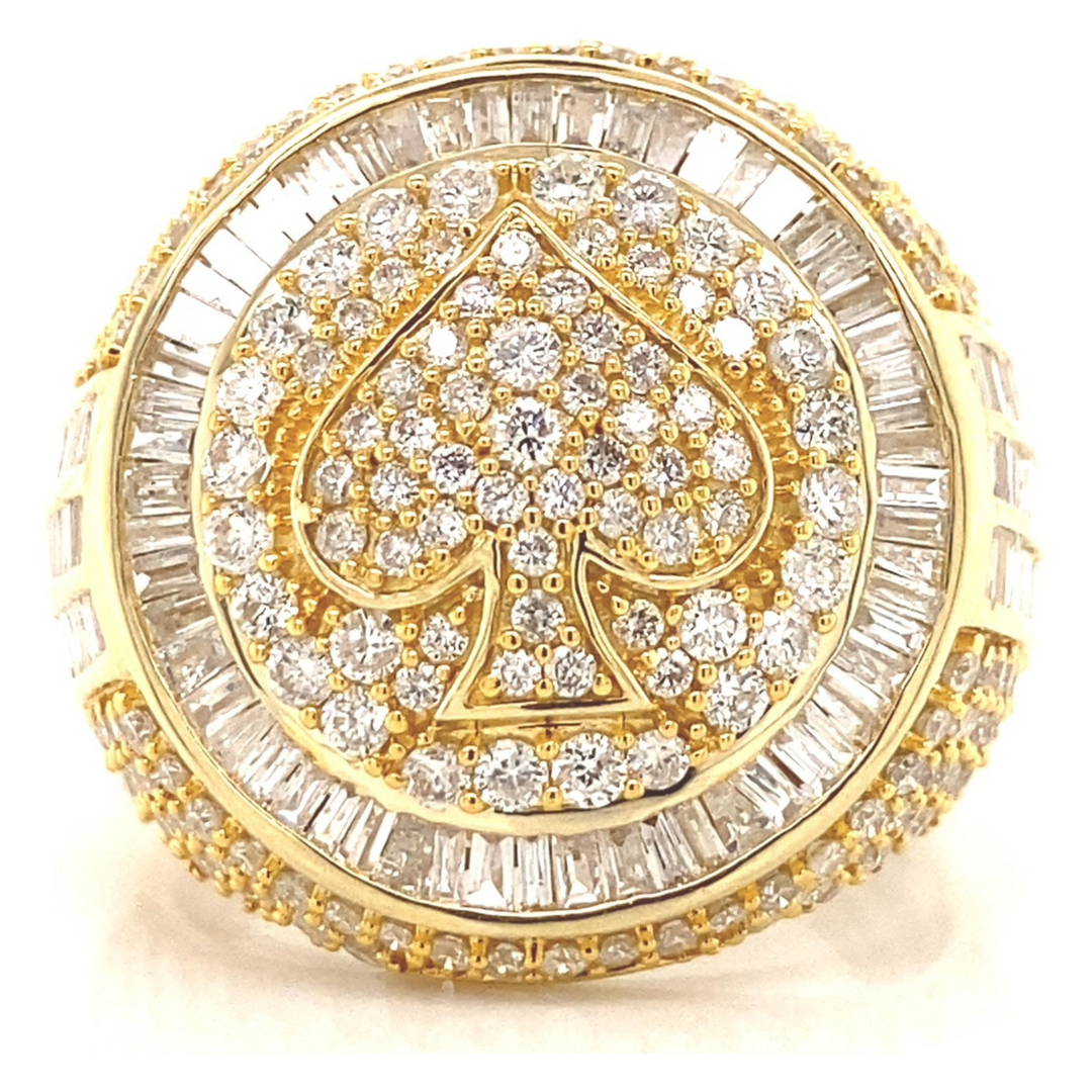 The Ace of Spades diamond men's ring brings your love of poker to your everyday wear! Superiorly hand-crafted and designed to perfection, the Ace of Spades stands out in this unique ensemble. This statement ring is finely detailed with 3 CTW in round and baguette VS1 clarity diamonds.