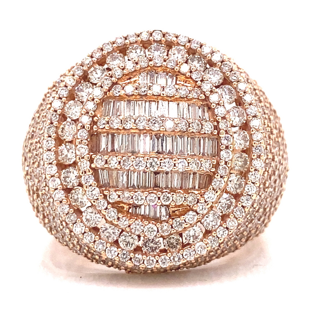 This 14K rose gold diamond cake ring is intricately built with 4 CTW in VS1 clarity diamonds. This ring makes a perfect gift or addition to a diamond ring collection.