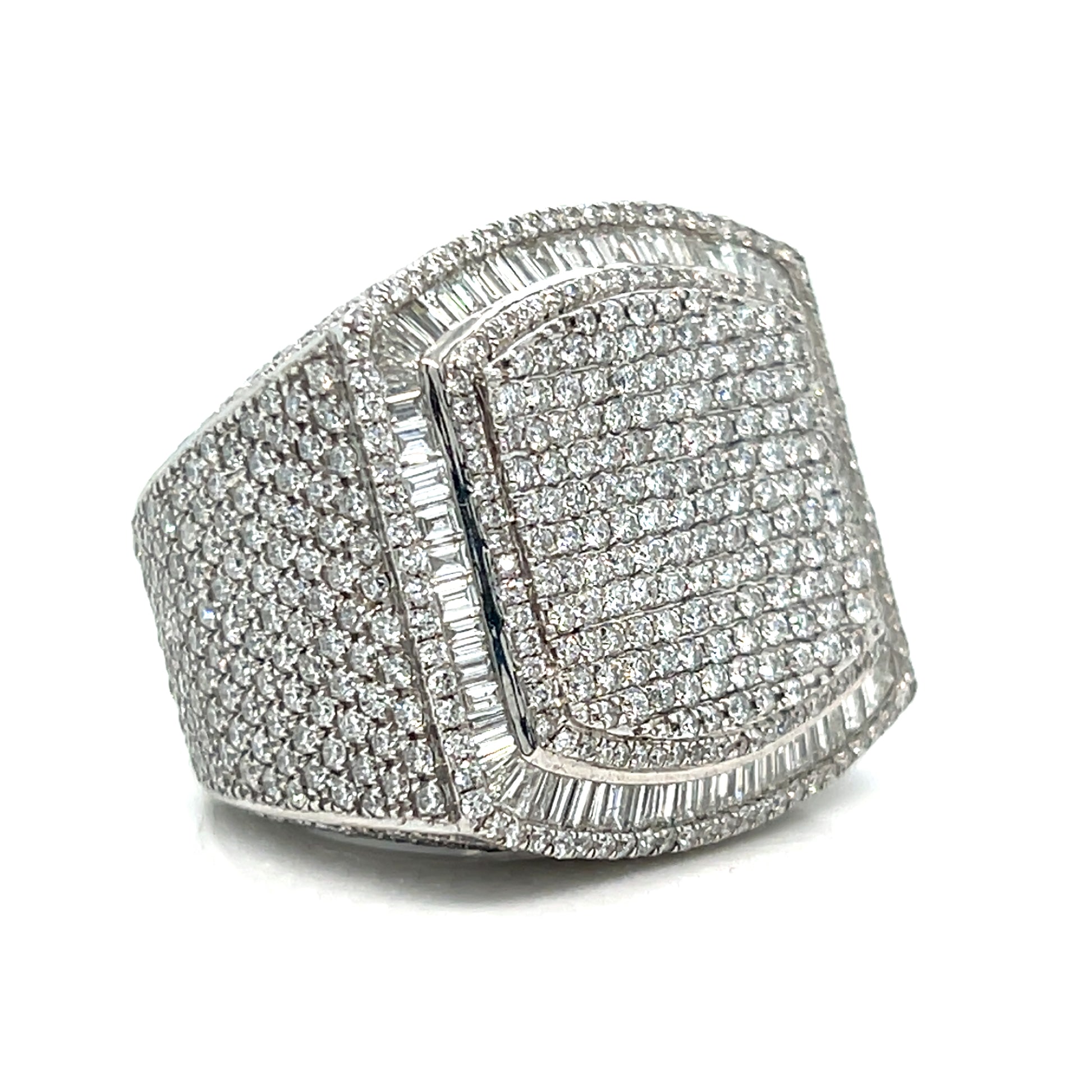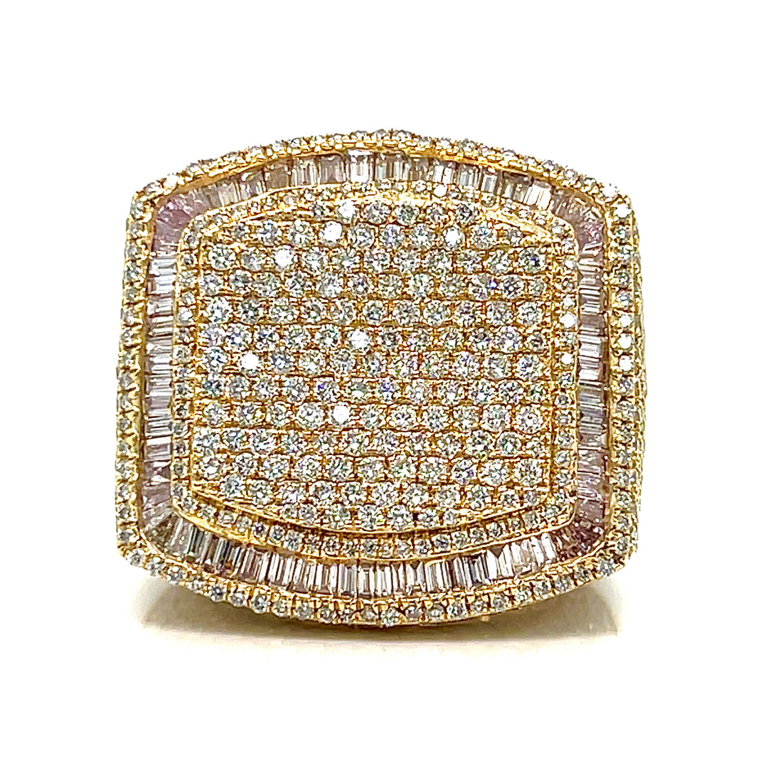 This stunning ring is crafted in 14kt gold and features approximately 9 carats total weight of VS1 diamonds. The design showcases a luxurious pave-set diamond centerpiece, framed by a halo of baguette and round diamonds.